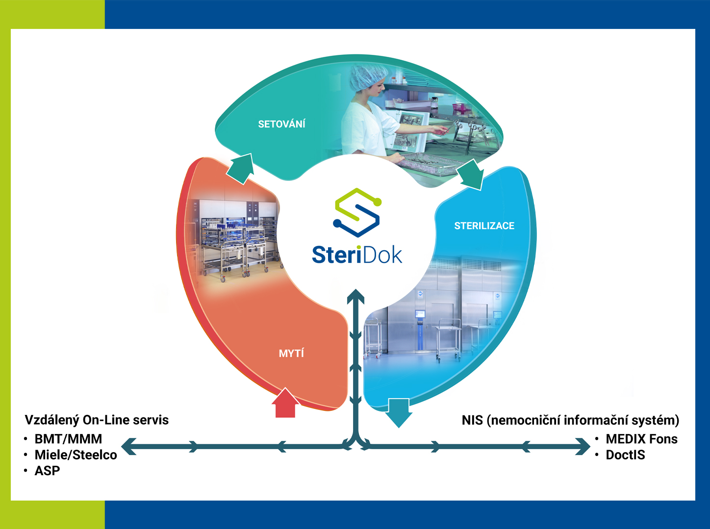Systém SteriDok® - umožňuje sledování a dokumentaci procesů z přístrojů firem BMT, MMM, Miele, Steelco a ASP na sterilizačních pracovištích a operačních sálech. Systém propojuje jednotlivé přístroje na sterilizačním pracovišti do jednoho celku a zajišťuje maximální transparentnost a dohledatelnost procesů, dohled na funkci CS vedoucími pracovníky nemocnice a především zvyšuje efektivitu hospodaření s materiálem.